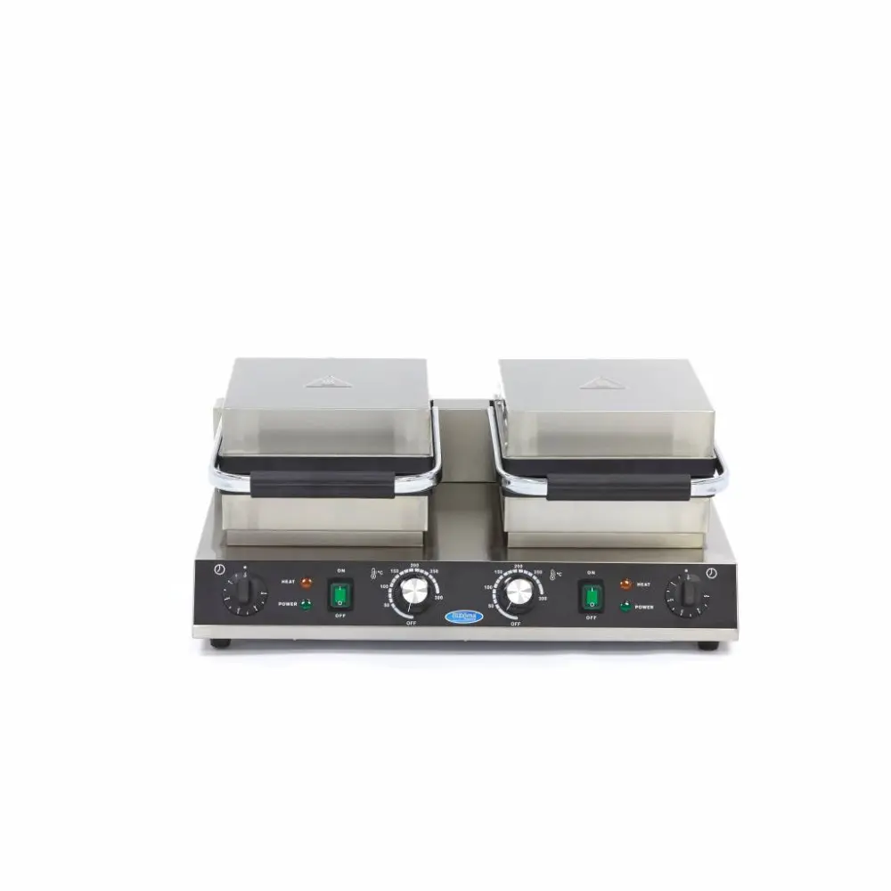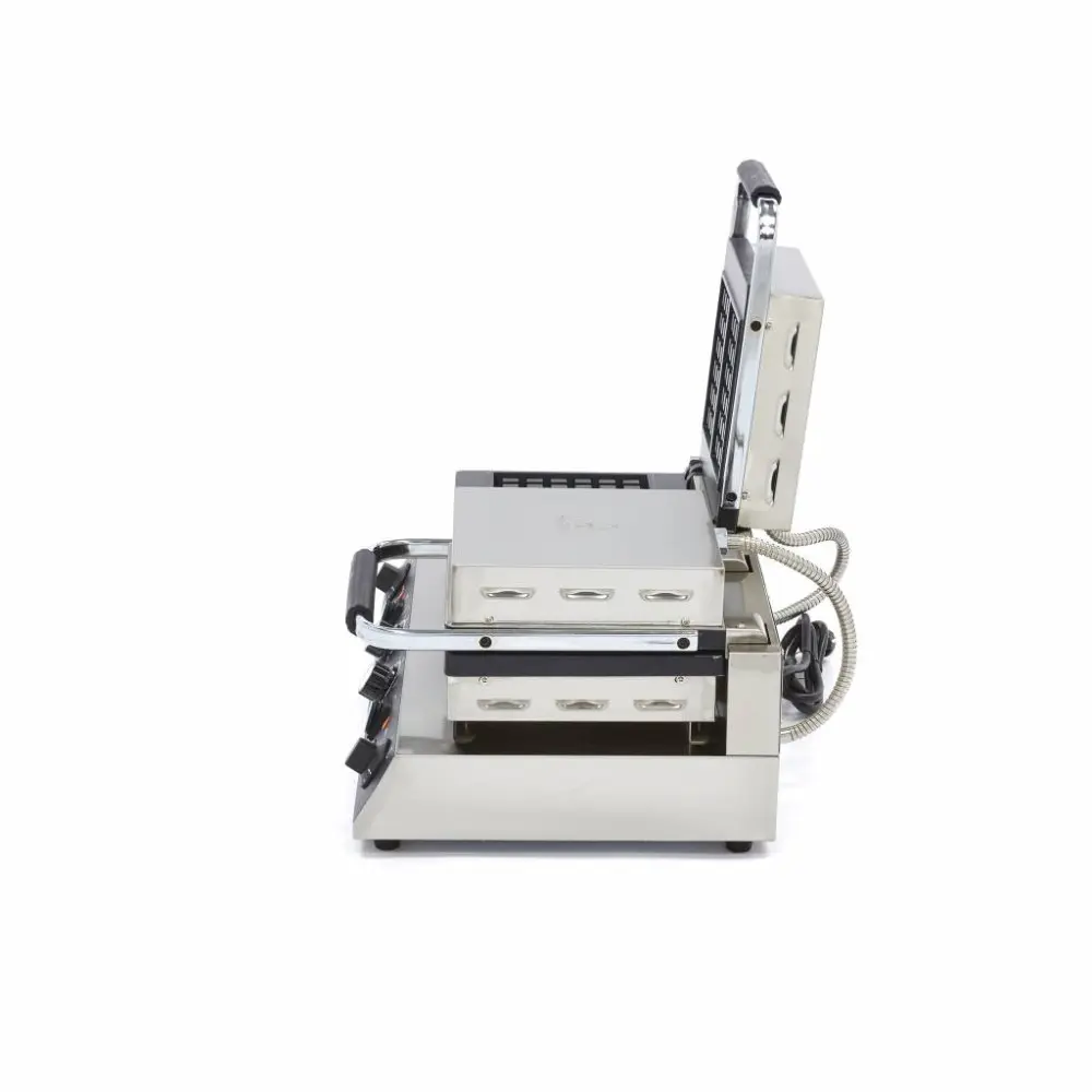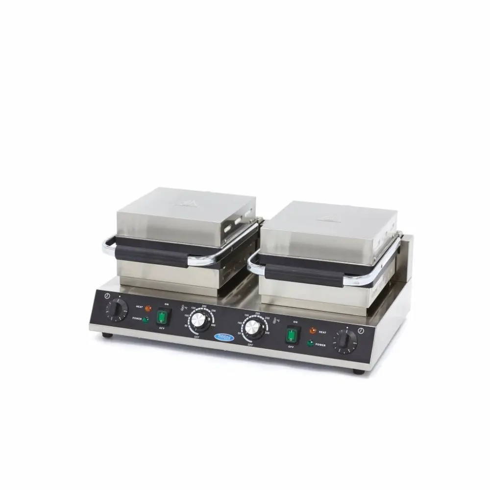 Tento klasický dvojitý vaflovač je vhodný pro přípravu čtyř belgických vaflí najednou. Má nepřilnavou hliníkovou pečicí desku a kryt z nerezové oceli. Pomocí robustních ovládacích knoflíků můžete nastavit požadovanou teplotu a časovač. Ideální pro profesionální použití.