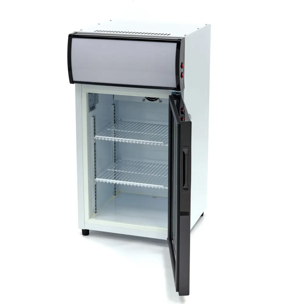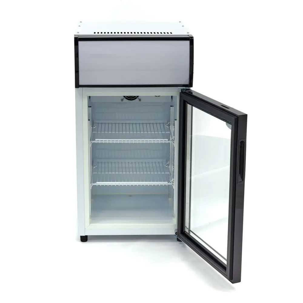 Pomocí této profesionální chladničky na nápoje můžete zákazníkům ukázat, jaké nápoje nebo občerstvení máte v nabídce. Jedná se o praktický a kompaktní stolní model s vnitřním LED osvětlením, které vám pomůže prezentovat váš sortiment. Kromě nápojů ji lze použít také k udržování chladu sendvičů nebo jiných potravin. Tato chladnička na nápoje má výklopná dvířka pro snadný přístup a je vybavena dvojitým sklem pro udržení správné teploty nápojů. Dveře jsou opatřeny zámkem, aby si zákazníci nemohli pomáhat. K dispozici je také osvětlený displej, který lze využít pro reklamu.