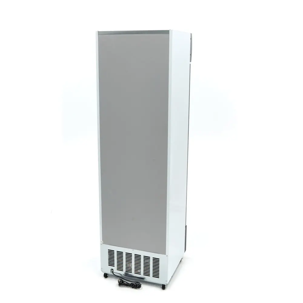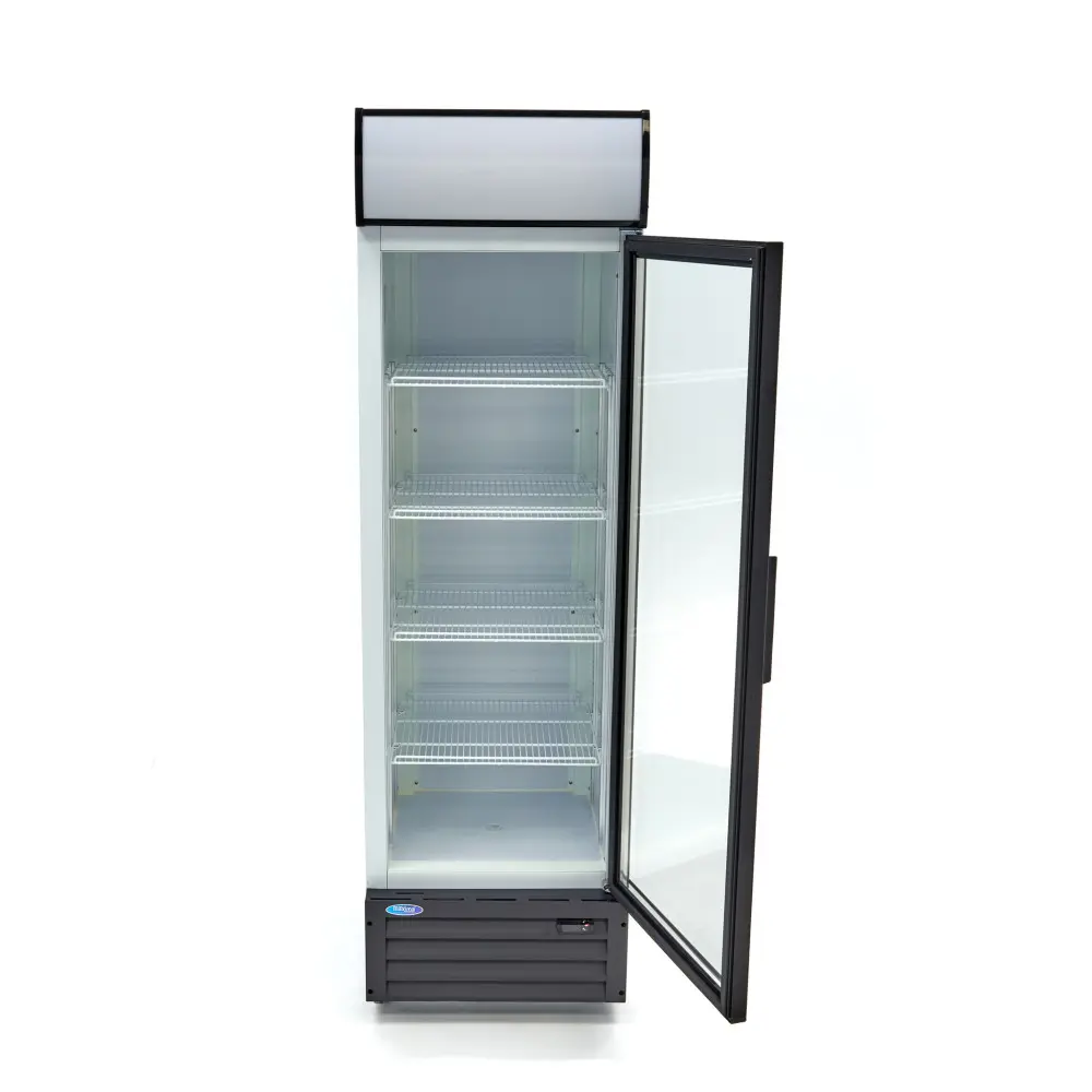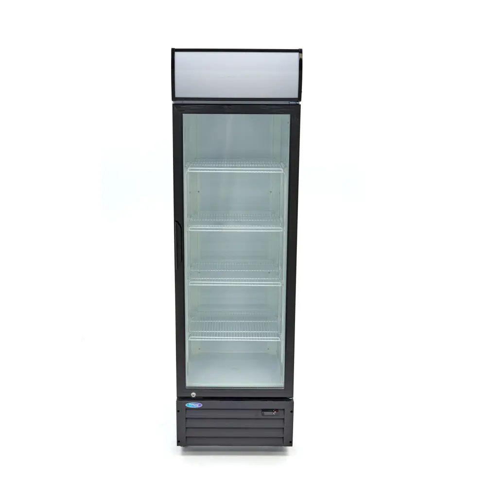 Tato profesionální chladnička na nápoje nabízí dostatek prostoru pro několik nápojů, ať už v lahvích nebo plechovkách, pro kavárny, restaurace nebo food trucky. Má osvětlený reklamní displej, výklopné dveře a čtyři výškově nastavitelné police. Má LED osvětlení a kolečka pro snadné přemisťování.