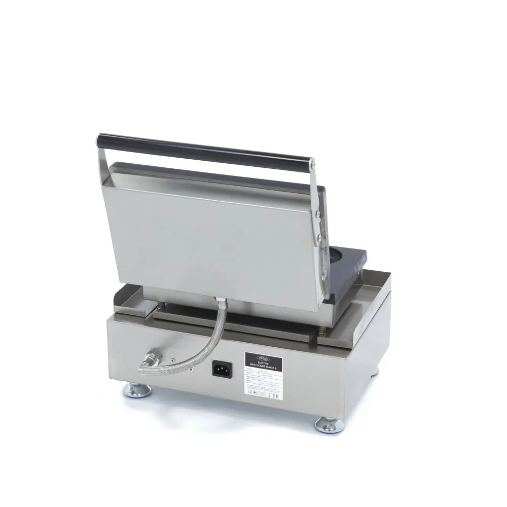 Tento malý, ale robustní přístroj na výrobu koblih je ideální pro přípravu šesti koblih o rozměru Ø 8 cm najednou. Pomocí analogových knoflíků můžete nastavit požadovanou teplotu a časovač. Je vyroben z nerezové oceli a hliníkové pečicí plechy mají nepřilnavý povrch. Tento přístroj na pečení koblih lze používat denně.