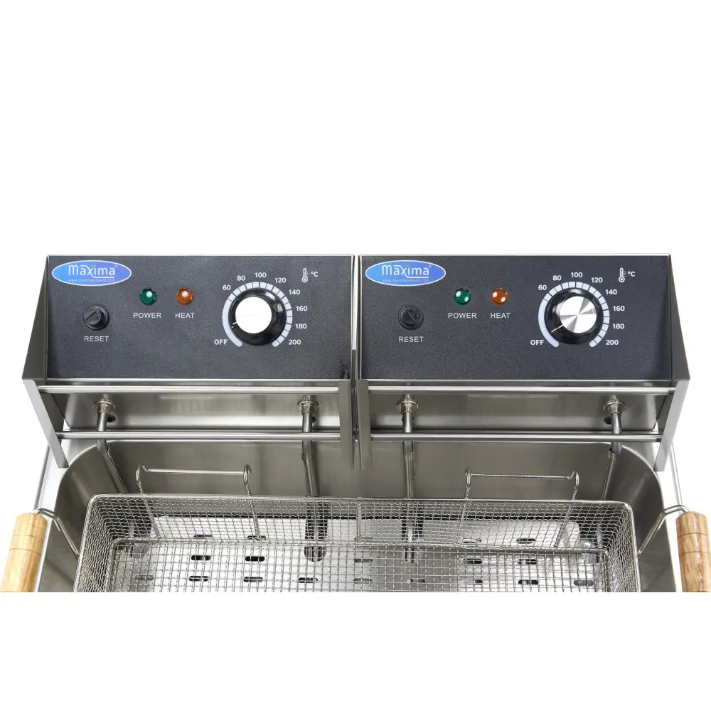 Pokud ve svém stravovacím zařízení pravidelně smažíte velké množství potravin, je tato profesionální fritéza s objemem 15 litrů ideální. Skládá se ze dvou samostatných topných těles a jednoho velkého fritovacího koše. Výhodou fritézy se dvěma topnými tělesy je, že nepotřebujete velký výkon. Nezáleží tedy na tom, v jaké kuchyni se nacházíte, fritézu stačí připojit do běžné elektrické zásuvky. Při zvedání fritovacího koše můžete použít žáruvzdorné rukojeti, které zabrání zranění, a dodávané víko zabrání rozstřiku oleje během používání. Gumové nožičky ve spodní části spotřebiče zajišťují jeho stabilitu a pevnost na většině povrchů.