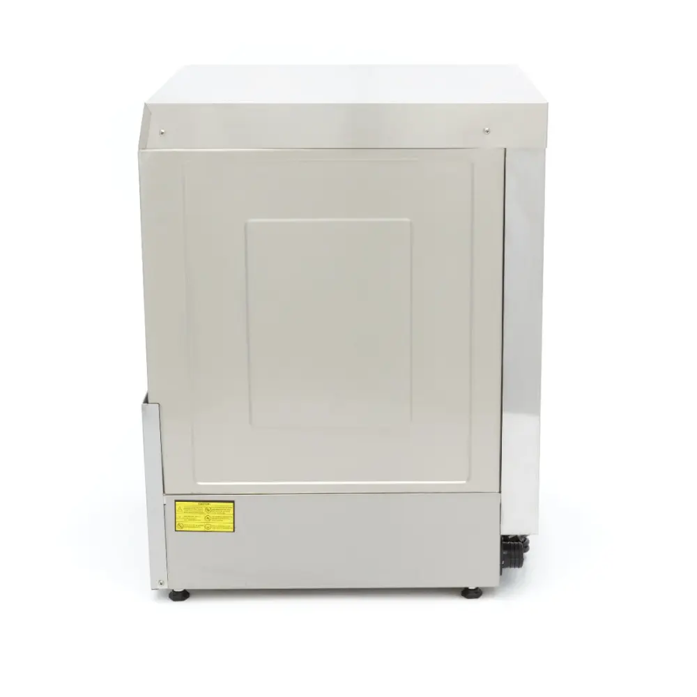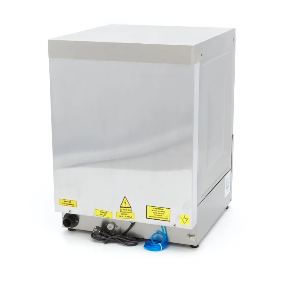 Tato myčka nádobí je velmi úsporná, neboť na jeden mycí cyklus spotřebuje pouze 2,8 l vody. Nabízí bezpečnostní funkce, jako je tepelná ochrana a ochrana IPX5 ovládacího panelu. Myčka se také snadno ovládá pomocí jediného tlačítka pro naplnění a ohřev vody v nádrži bojleru. Digitální tlakový spínač prací nádrže umožňuje snadné nastavení hladiny vody, zatímco termostat ovládá NTC čidlo. Nádobí se myje při 55-60 °C a oplachuje při 80-85 °C, což vede k rychlejšímu sušení. Můžete si zvolit předehřátí vody nebo začít se studeným mytím. Čtyři kontrolky ukazují stav naplnění, ohřevu, mytí a délku programu. Po dokončení cyklu myčka vydá zvukový signál. Dodává se s košem na sklo o rozměrech 50 x 50 cm, košem na talíře o rozměrech 50 x 50 cm, košem na příbory a přívodní a vypouštěcí hadicí pro připojení k přívodu vody. Součástí myčky je oplachové čerpadlo, nikoli však mýdlové a vypouštěcí čerpadlo. Čtyři nastavitelné nožičky umožňují snadné přizpůsobení výšky.