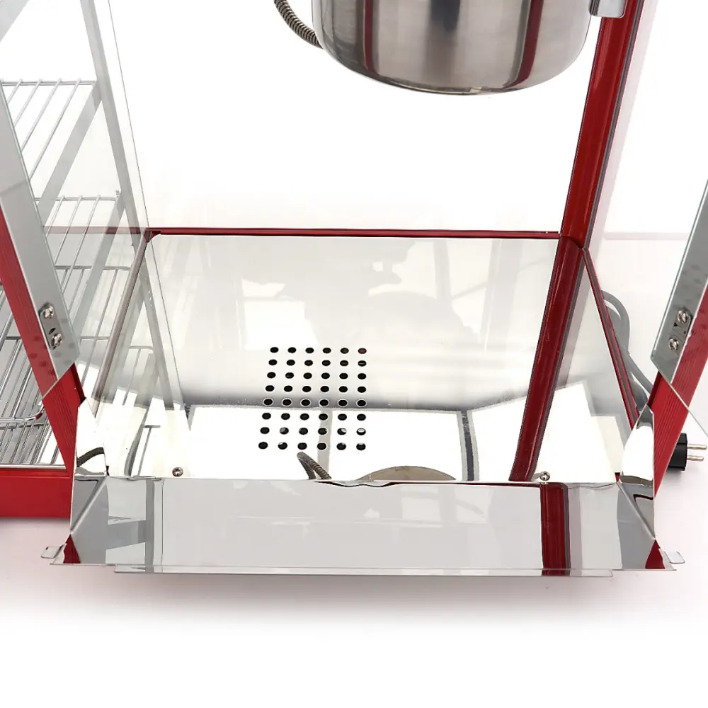 Tento popcornovač snadno a rychle připraví lahodný, sladký nebo slaný popcorn. Zahřejte popcornovač, přidejte ingredience a za dvě minuty máte horký popcorn. Díky skleněným dvířkům můžete sledovat proces poppingu a zůstane vám bezpečný. Má ohřívací vitrínu, která udržuje zásoby teplé.