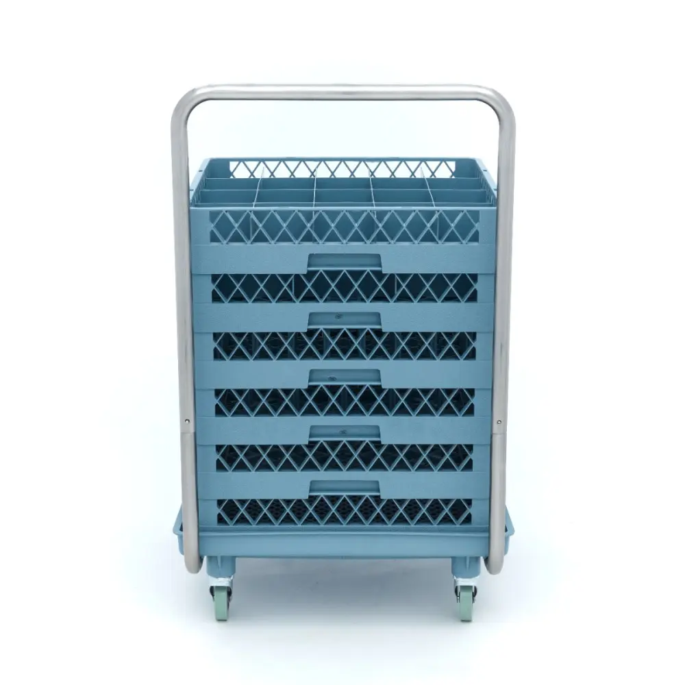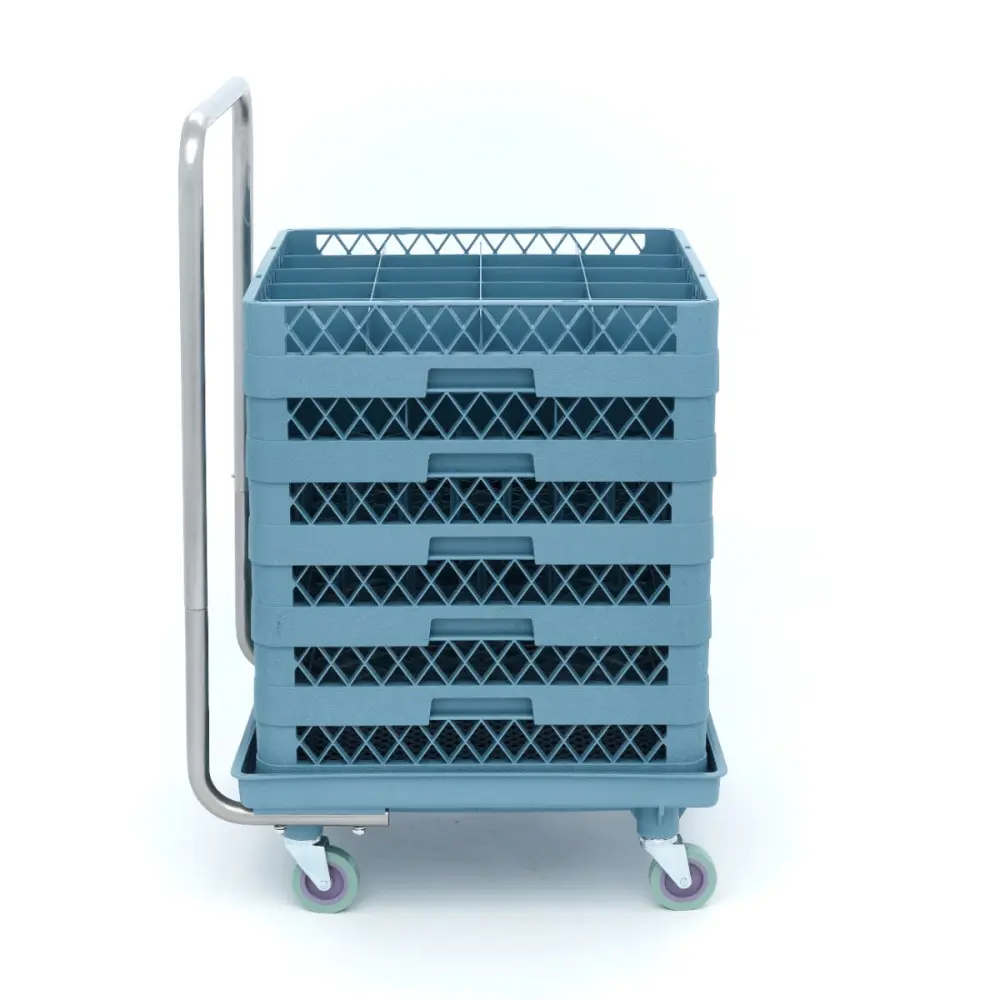 Tento nerezový vozík pro přepravu regálů do myčky nádobí je speciálně navržen pro přepravu regálů do myčky nádobí. Na vozík můžete bezpečně naskládat všechny stojany a nástavce na myčky nádobí a přemisťovat je v kuchyni. Má skládací rukojeť, takže nezabírá mnoho úložného prostoru.