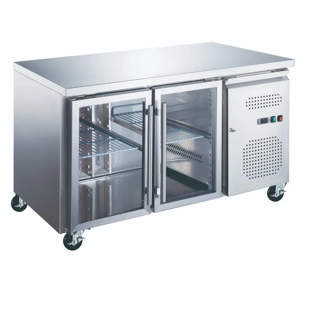 Tato pultová chladnička z nerezové oceli má dvoje skleněné dveře a za každými dveřmi je výškově nastavitelná mřížka. Má digitální displej, funkci automatického odmrazování a kolečka pro snadné přemisťování. Pultová chladnička udržuje čerstvé suroviny chlazené a čerstvé, což je ideální pro profesionální kuchyně.