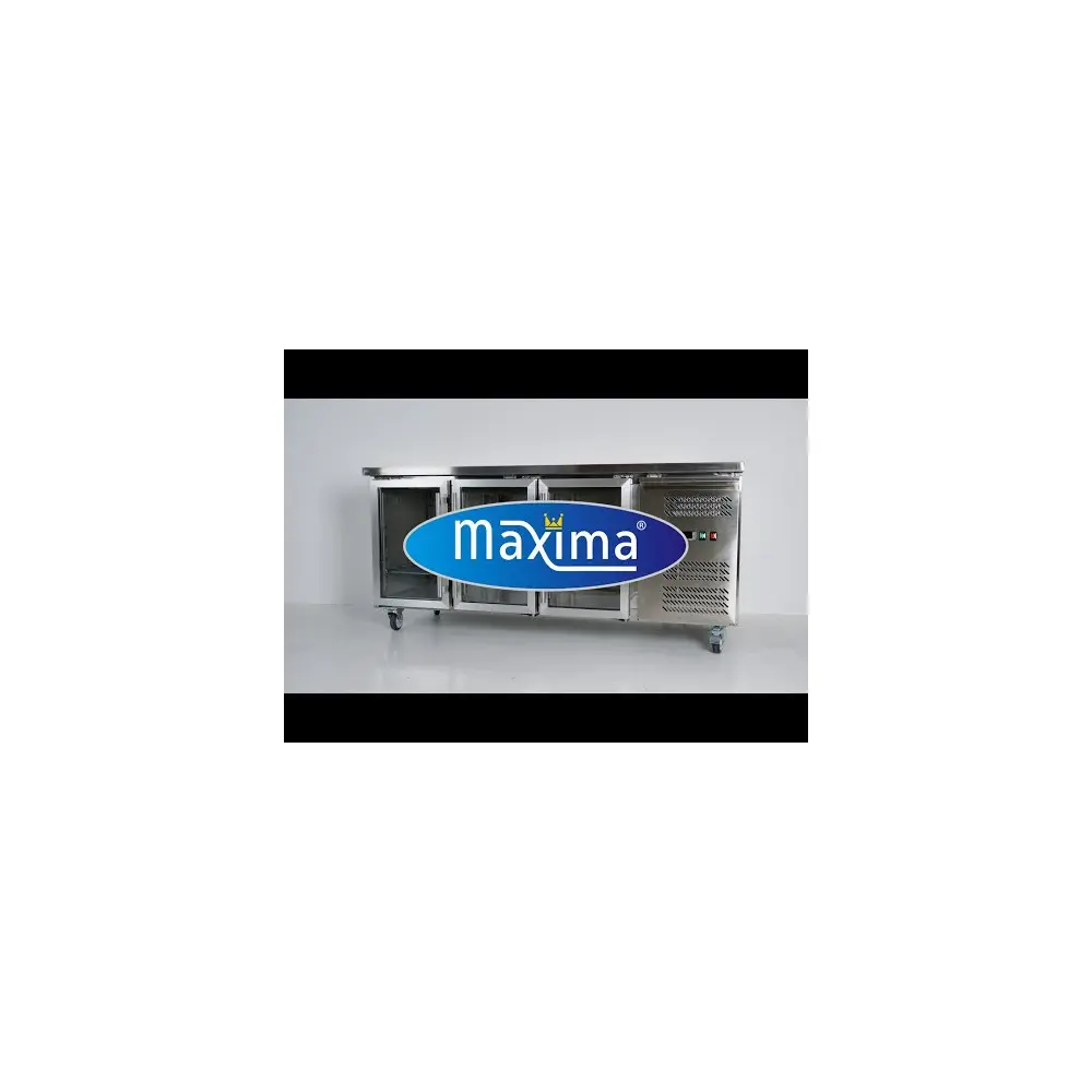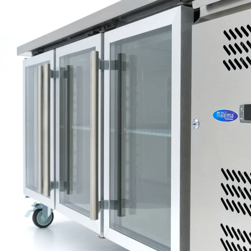 Tato pultová chladnička má 180 cm širokou pracovní desku, která je dostatečně prostorná na krájení zeleniny nebo přípravu pokrmů. Pod pracovní deskou jsou tři skleněné dveře s mřížkami a kompresorový prostor s výkonným chladicím systémem.