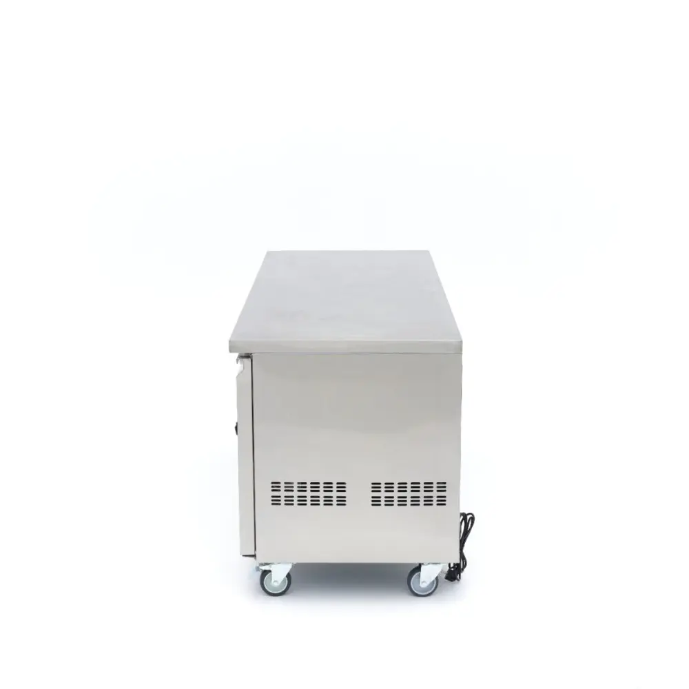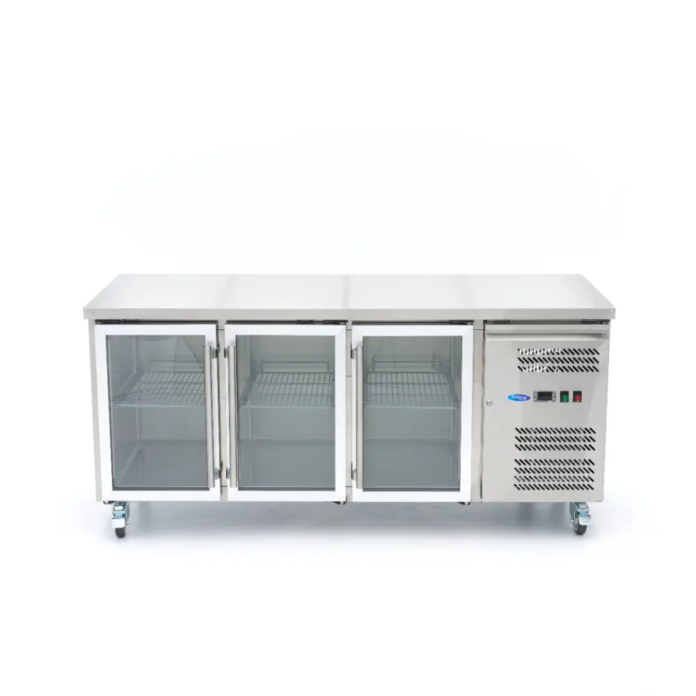 Tato pultová chladnička z nerezové oceli má troje skleněné dveře a za každými dveřmi je výškově nastavitelná mřížka. Má digitální displej, funkci automatického odmrazování a kolečka pro snadné přemisťování. Pultová chladnička udržuje čerstvé suroviny chlazené a čerstvé, což je ideální pro profesionální kuchyně.