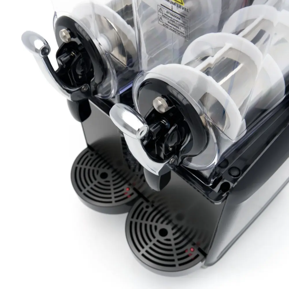S tímto profesionálním výrobníkem břečky s 2 x 12l nádržemi, dvojitým kohoutkem a odděleným ovládáním můžete podávat dvě příchutě najednou. Ideální pro podávání granity a džusu současně ve vašem baru nebo kavárně. K dispozici ve třech modelech, s 63 barvami osvětlení nádrží a sedmi úrovněmi hustoty.