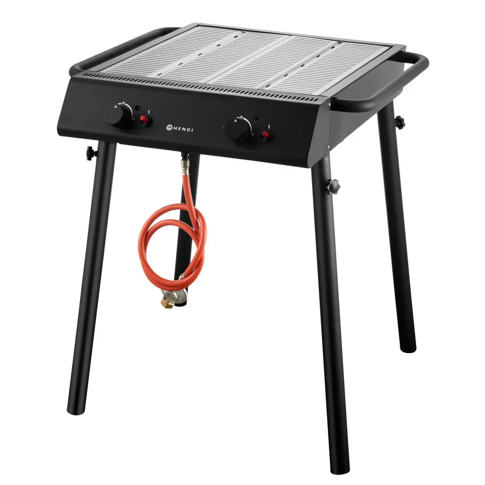 Značka HENDI - 148631 Robustní nerezová konstrukce. Stabilní 4 nohy lze demontovat, což značně usnadňuje přepravu grilu. Utěsněné pouzdro chrání hořáky před větrem, díky čemuž zařízení udržuje vysokou teplotu a je účinné. Vyvíjení vysokých teplot usnadňuje čištění roštu. Vybaveno 2 nezávislými hořáky s elektrickým zapalováním a teplotním čidlem. Včetně plynové hadice a regulátoru tlaku. Vhodné pro LPG. Grilovací plocha 540x540 mm (2 rošty, každý o rozměrech 540x270 mm). Hlavní kryt hořáků je smaltován v černé barvě. Přední panel a nohy lakované černou práškovou barvou.