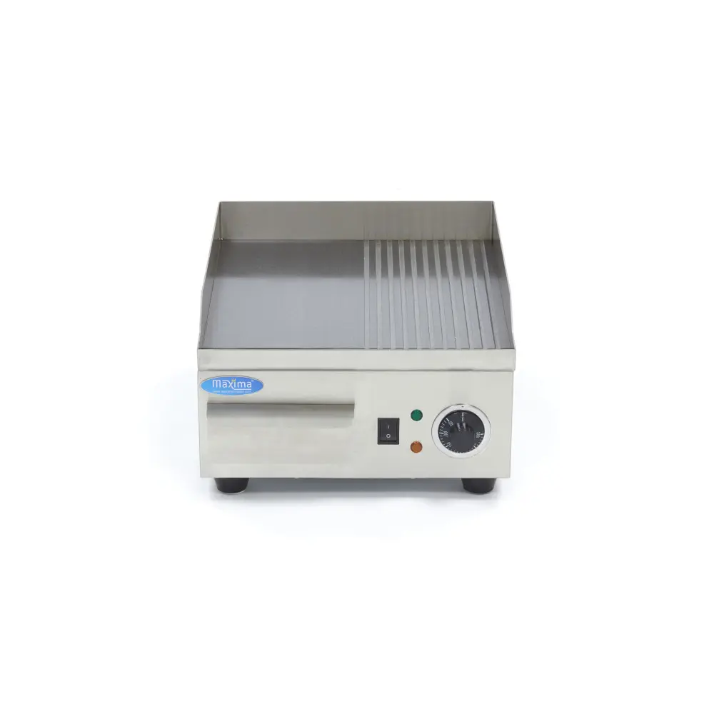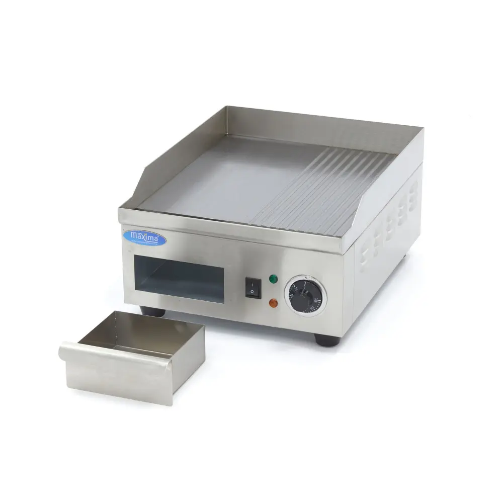 Tento malý elektrický gril je vyroben z vysoce kvalitní nerezové oceli a má hladkou a drážkovanou desku pro grilování masa, ryb, zeleniny nebo vajec. Díky svému malému provedení se skvěle hodí do potravinářského vozu nebo profesionální kuchyně. Díky vyjímatelnému zásobníku na tuk se tento rošt snadno udržuje v čistotě.