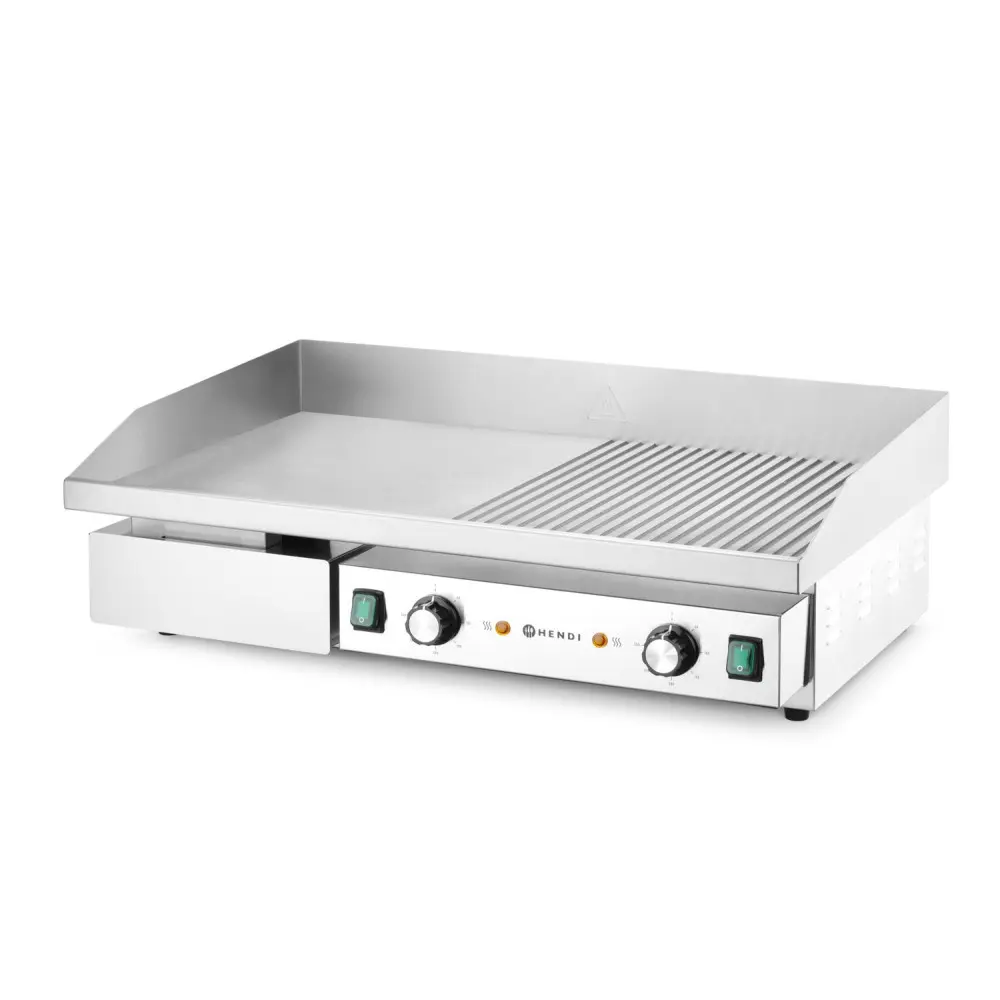 Značka HENDI - 154991 Rošt má rozměry 717x383 mm a je napůl žebrovaný. Pevná 10 mm silná tvrzená ocelová deska nabízí vynikající zadržování tepla. Nabízí 2 samostatně nastavitelné topné zóny. Dodává se bez zástrčky.
