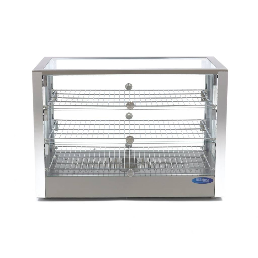 Tato vyhřívaná vitrína na potraviny je vyrobena z vysoce kvalitních materiálů. Konstrukce z nerezové oceli je velmi robustní, takže má dlouhou životnost a odolnost. Díky výkonnému topnému tělesu je teplo účinně rozváděno po celém vyhřívaném stojanu na potraviny. Tento spotřebič je také vybaven zásobníkem pro zvlhčování vzduchu. Uvnitř najdete praktické LED osvětlení, aby zákazníci snadno viděli na produkty, které jsou prezentovány profesionálním způsobem. Pomocí analogového knoflíku lze plynule regulovat teplotu v rozmezí 30 až 90 ºC. Kontrolka signalizuje dosažení nastavené teploty